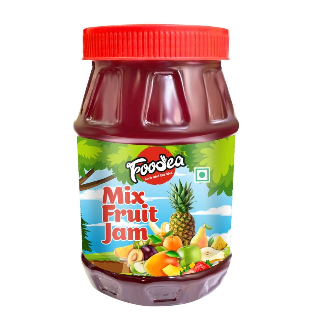 Foodea Mix Fruit Jam is made from crushed or chopped fruits and sugar. Jam will hold its shape, but it is less firm than jelly. Jams made from a mixture of fruits are usually called conserves Quantity – 1 kg